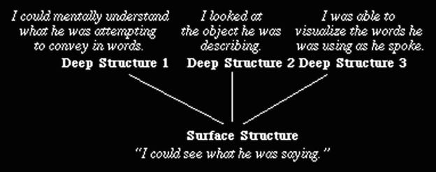 When it comes to syntax, Chomsky is famous for proposing that beneath every sentence in the mind of a speaker is an invisible, inaudible deep structure, the interface to the mental lexicon. The deep structure is converted by transformational rules into a surface structure that corresponds more closely to what is pronounced and heard.