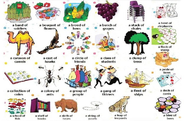 - Combination of words (e.g., a swarm of bees, a bunch of flowers)