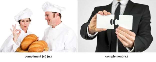 Complement — is when two things go well together, or complete each other. This word is often used in food and fashion to describe matching styles or ingredients.