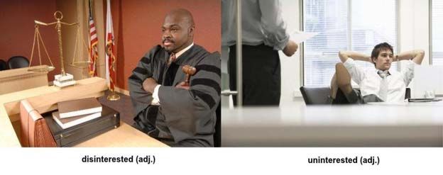 Many native speakers use these two words with the same meaning – bored or not interested. That’s undoubtedly the meaning of uninterested, but it’s not the meaning of disinterested. The real meaning of disinterested is impartial, objective, or not taking sides in an argument. A judge hearing a court case should be disinterested but not uninterested!
