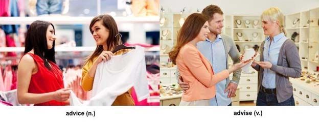 These words have similar spellings and meanings and only slightly different pronunciations. Advice — with an “s” sound — is a noun. You can give your friend some advice.
