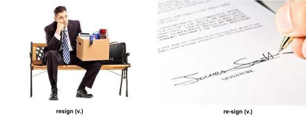 These two words have identical spellings – except for the hyphen – and opposite meanings. Resign — without the hyphen — means to quit your job, and the “s” is pronounced like a “z.”
