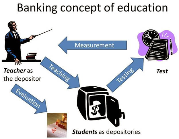 In the book, Freire calls traditional pedagogy the “banking model of education” because it treats the student as an empty vessel to be filled with knowledge, like a piggy bank. He argues that pedagogy should instead treat the learner as a co-creator of knowledge. He believes the fundamental nature of education is to be narrative. There is one individual reciting facts and ideas (the teacher) and others that just listen and memorize everything (the students). There is no connection with their real-life, resulting in a very passive learning style. This form of education is termed the banking model of education.