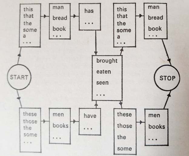 The simplest grammars discussed by Chomsky that are capable of generating an infinite number of sentences using a finite number of recursive rules operating upon a finite vocabulary are what he calls finite-state grammars. These are based on the view that sentences are generated using a series of choices made from left to right: that is to say, after the first, or leftmost, element has been selected, every subsequent choice is determined by the immediately preceding elements. One way of representing graphically what has just been said in words is using the ‘state diagram’.