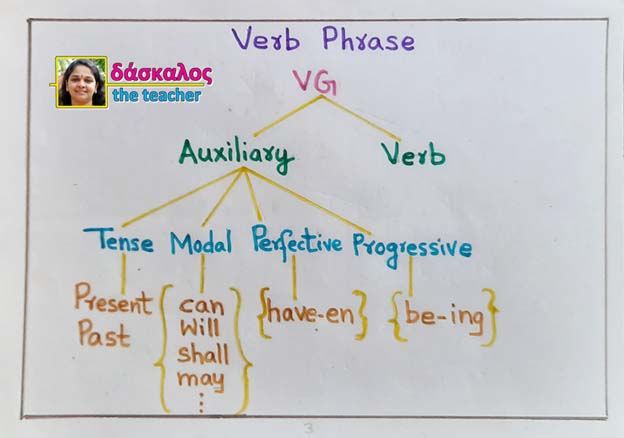 The verbal group generally immediately follows the NP in a typical English sentence. It consists of the main verb and the auxiliary.