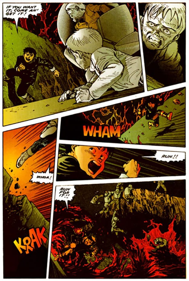 Regular grid layouts create order and stability, while irregular layouts suggest chaos or emotional intensity. Full-page images emphasise key moments and slow down reading. Visual elements such as colour, framing, and perspective further enhance meaning. In The Dark Knight Returns, fragmented layouts and dramatic contrasts reflect tension and psychological conflict.