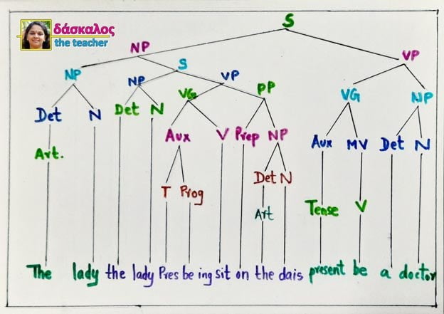 Thus the generalised phrase marker is: The lady (the lady pres- be-ing-sit on the dais)