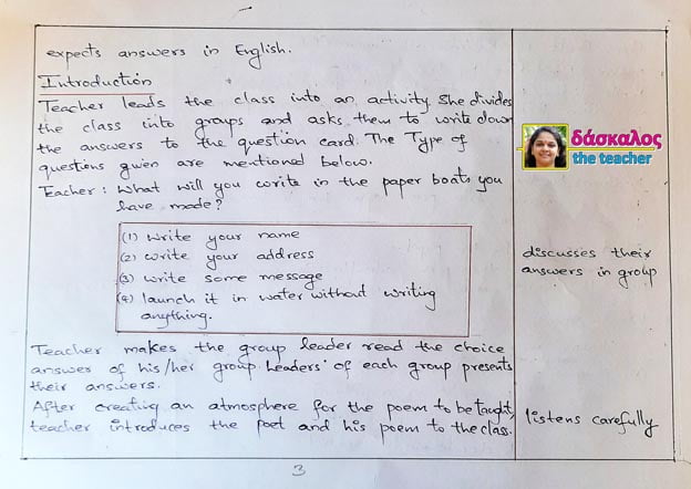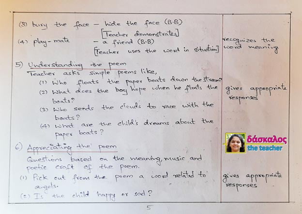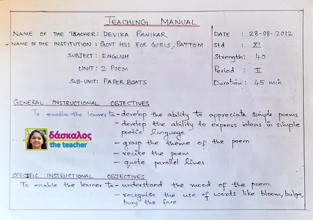 A good teacher of poetry should know the aim of her teaching poetry. She must be able to transmigrate into the poet. She must master language, a poetic sense and temperament, and good content knowledge to bring out the poem’s soul. She must help her students not only be aware of the poem’s theme but also to imagine and appreciate the mood of it.