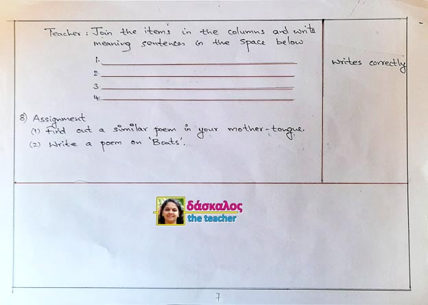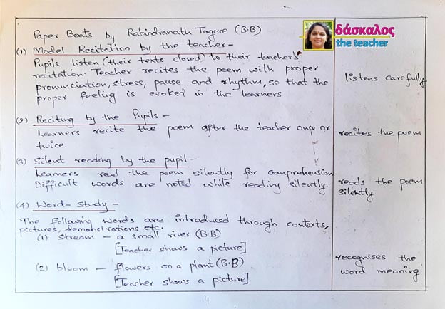 While the learners read the poem aloud, performing in groups in the beginning is better. Solo performance must be encouraged when they become familiar with words and the poem’s rhythm. The teacher must check the articulation, stress rhythm, and intonation while reading. During silent reading by the learner, the teacher should advise them to read with comprehension and appreciation and point out the difficult words. Word study in detail must be avoided as far as possible.