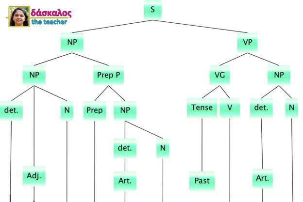 The grammatical constituents in a sentence, like Noun Phrases, Verb Phrases, Adverbials and Preposition Phrases, can be further divided into categories such as Nouns, Adjectives, Verbs, Tenses and Morphemes.