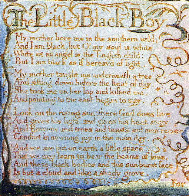 William Blake was the most remarkable poet among the precursors of the Romantic Revival in English. The Little Black Boy is an 18th-century poem from his collection Songs of Innocence and Experience, in which a Black child attempts to figure out his place in this world and the next, that is, in the spiritual afterlife. The poem is considered to be one of the most uncomfortable of Blake’s poems because it deals with the issues of racism and slavery. The black race suffers to teach the white world wisdom, but the black child deplores his colour since it seems to prevent the world from realizing his purity of soul. The poem says that race will cease to matter when the speaker is united with God in the afterlife and thus argues that divine love transcends race and that all races are equal in the eyes of God.