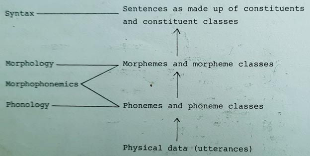 One of the most essential concepts in structural grammar is ‘class of’. This being the case, structural linguistics is often referred to by transformational generative grammarians as taxonomic linguistics. The taxonomic model of linguistic description, as it developed over the years, may be represented diagrammatically in roughly the following way: