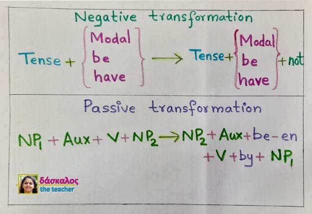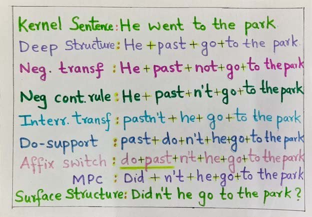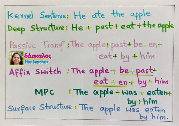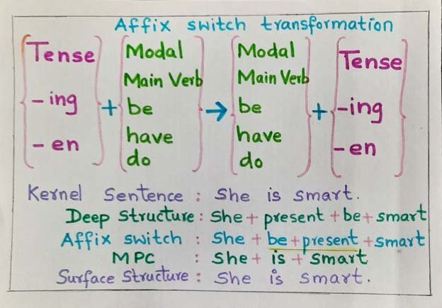 TG grammar assumes that there are only kernel sentences at the deep structure level. Transformations are thus used to convert the deep structure to surface structure. Transformations may be obligatory or optional. An example of obligatory transformation is Affix transformation or Affix Switch transformation. Transformations like Negative or Negation, Passive transformations are all optional. This may or may not be applied to the structure. The Affix Switch rule is an obligatory T rule when the affix followed by the verb is changed to a verb followed by affix.