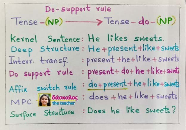 In sentences with no modal have or be, a dummy verb do is supplied. This rule is known as the do support rule or do insertion rule.